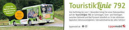 Entdecke Lippe mit Bus und Bahn – perfekt zum Wandern, Radfahren oder Sightseeing! Der Naturparkbus auf der TouristikLinie 792 bringt dich von Ostern bis 1. November stündlich an Wochenenden und Feiertagen zu spannenden Ausflugszielen. Dein Fahrrad kann mit! Außerdem bist du in Bad Salzuflen, Detmold und Lemgo mit dem Stadtbus flexibel unterwegs.
